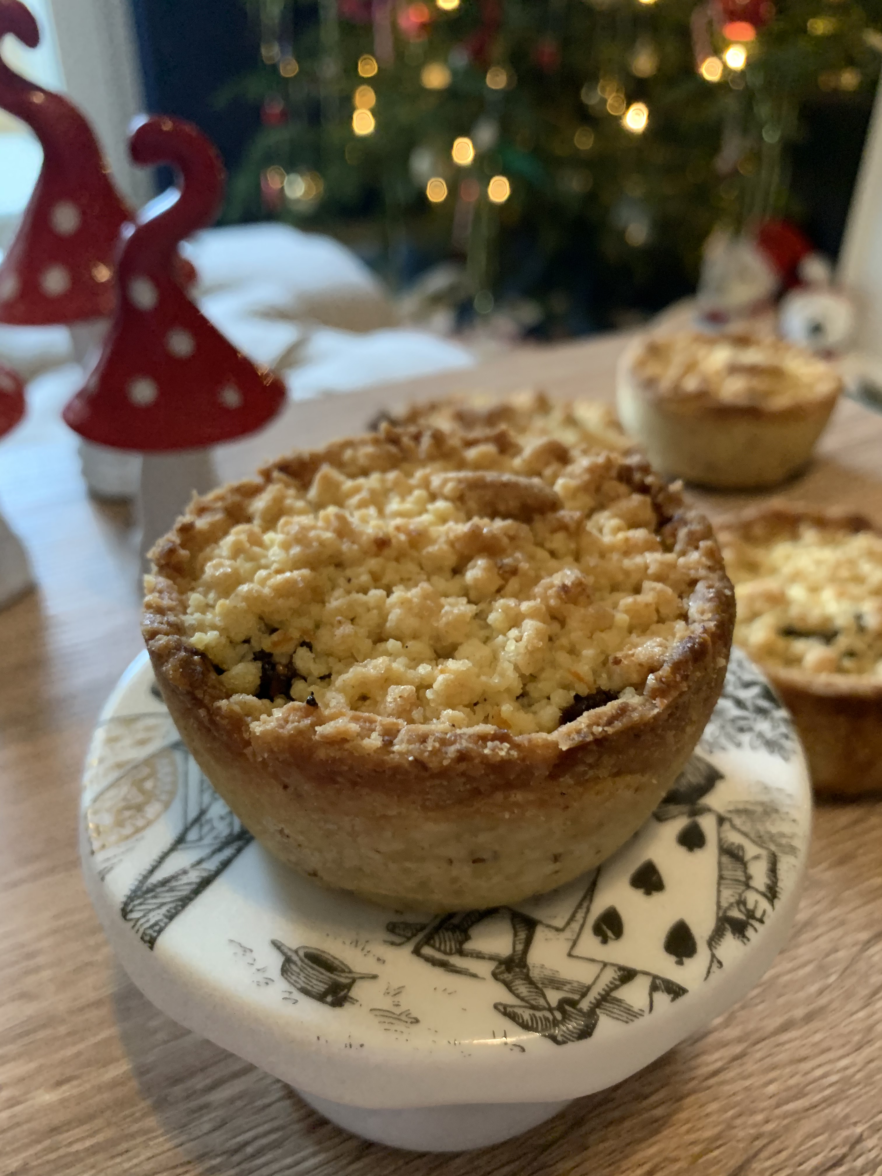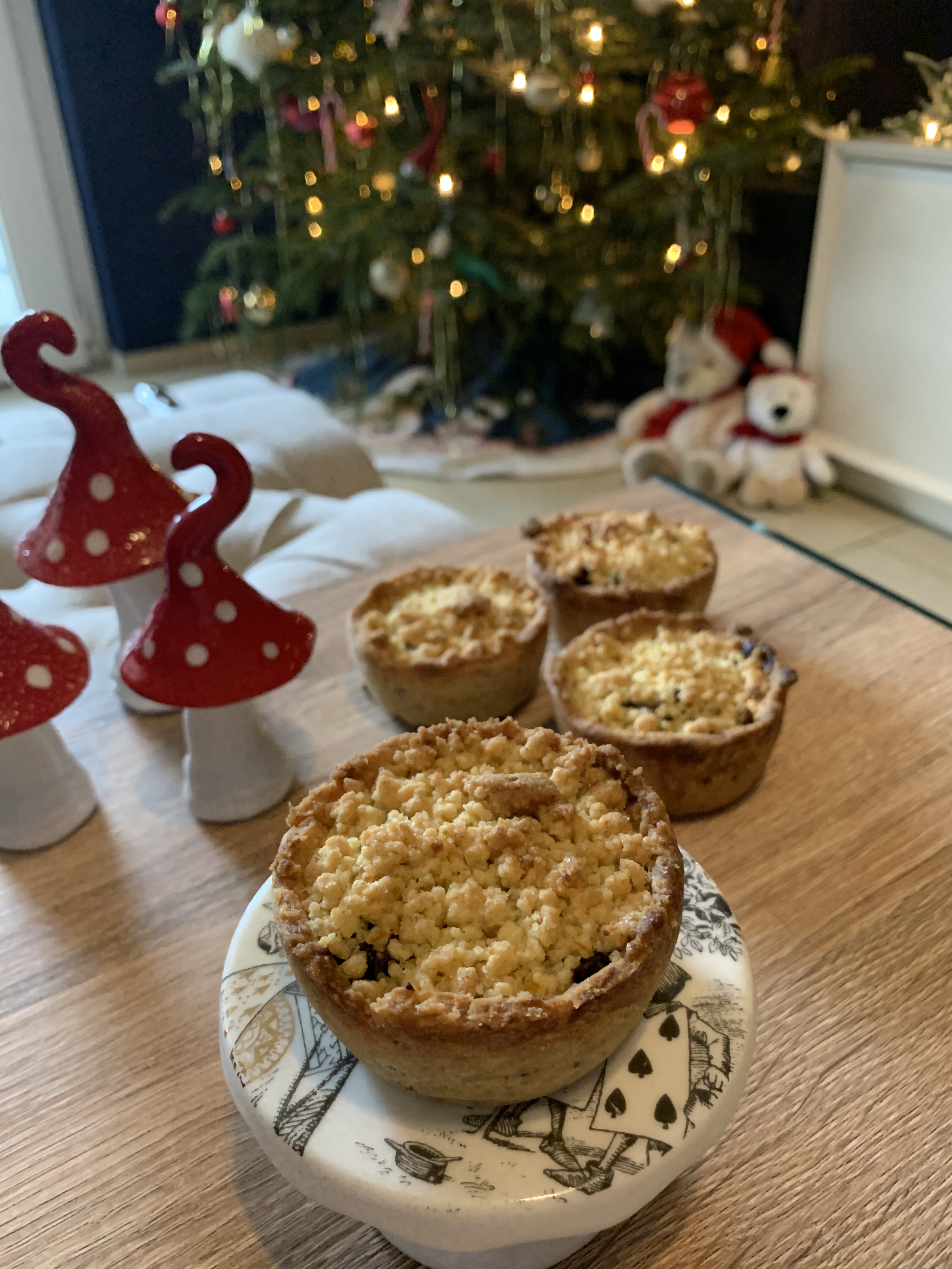 - Drop one heaped tablespoon of MINCEMEAT into the cases and sprinkle the crumble over the top. It’s up to you how much crumble you use as it is down to personal taste. I was very generous with my crumble and practically drowned my pies with it because I love the stuff!