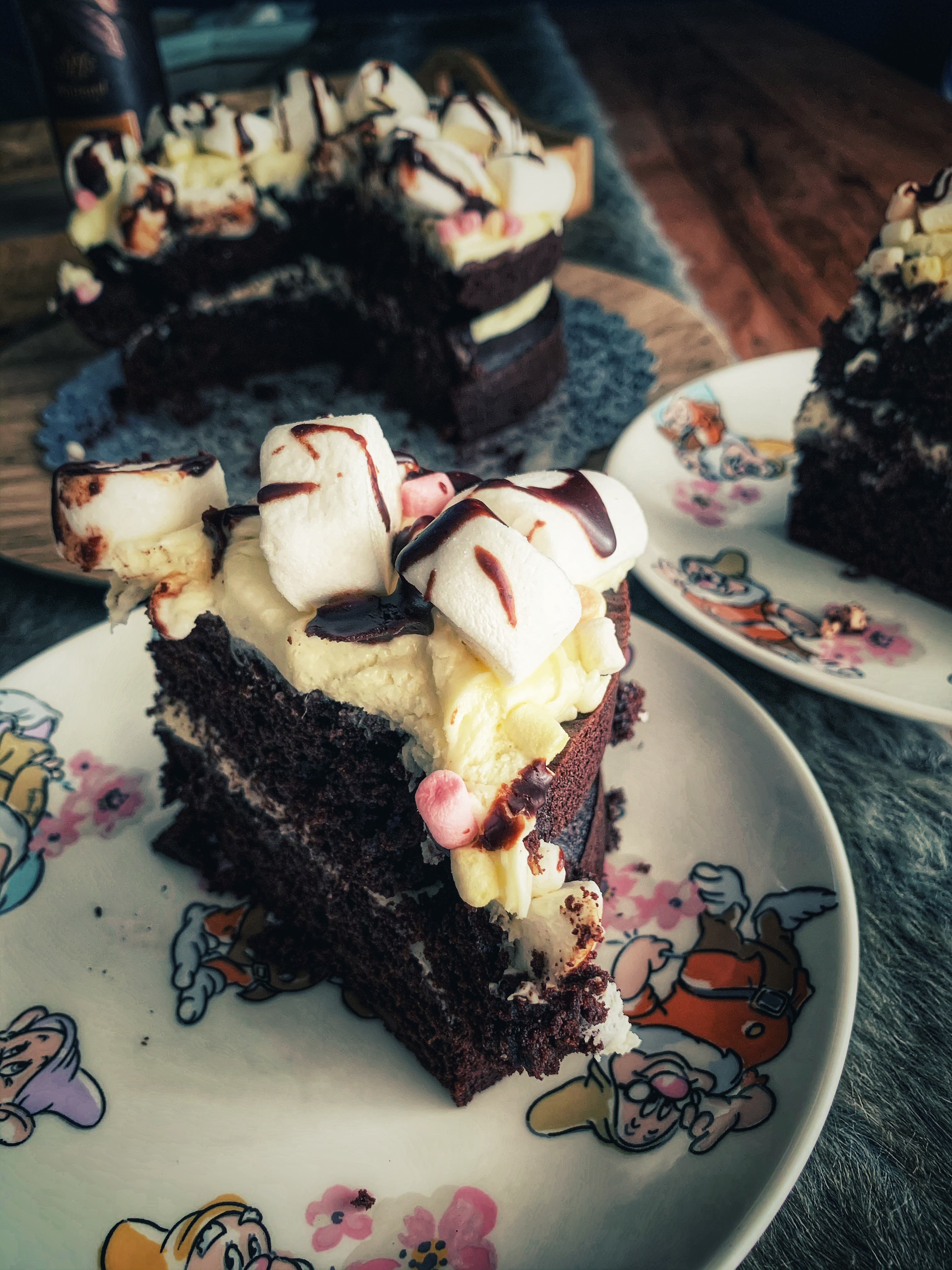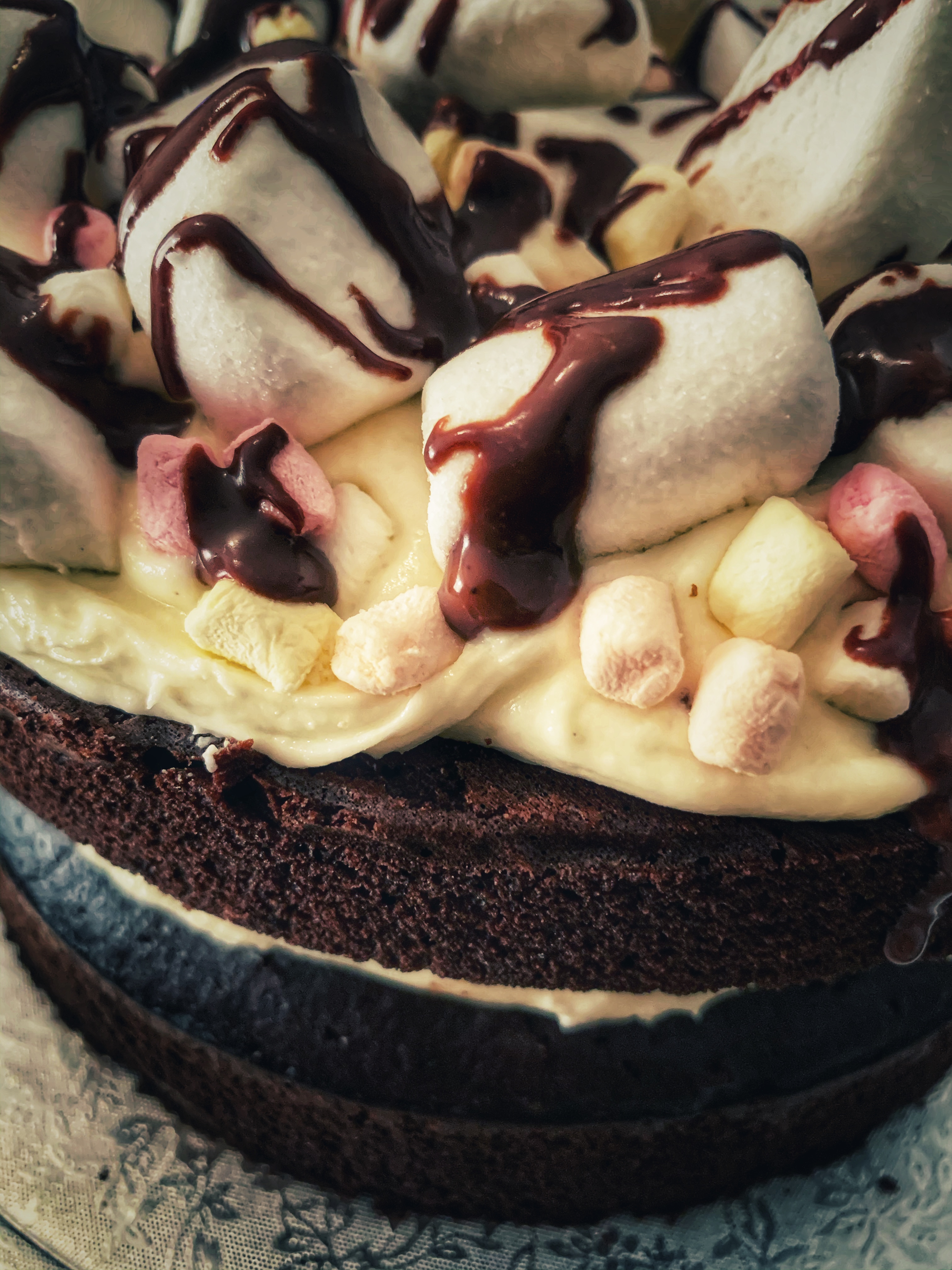 - Top the cake with marshmallows and drizzle the fudge sauce on top.