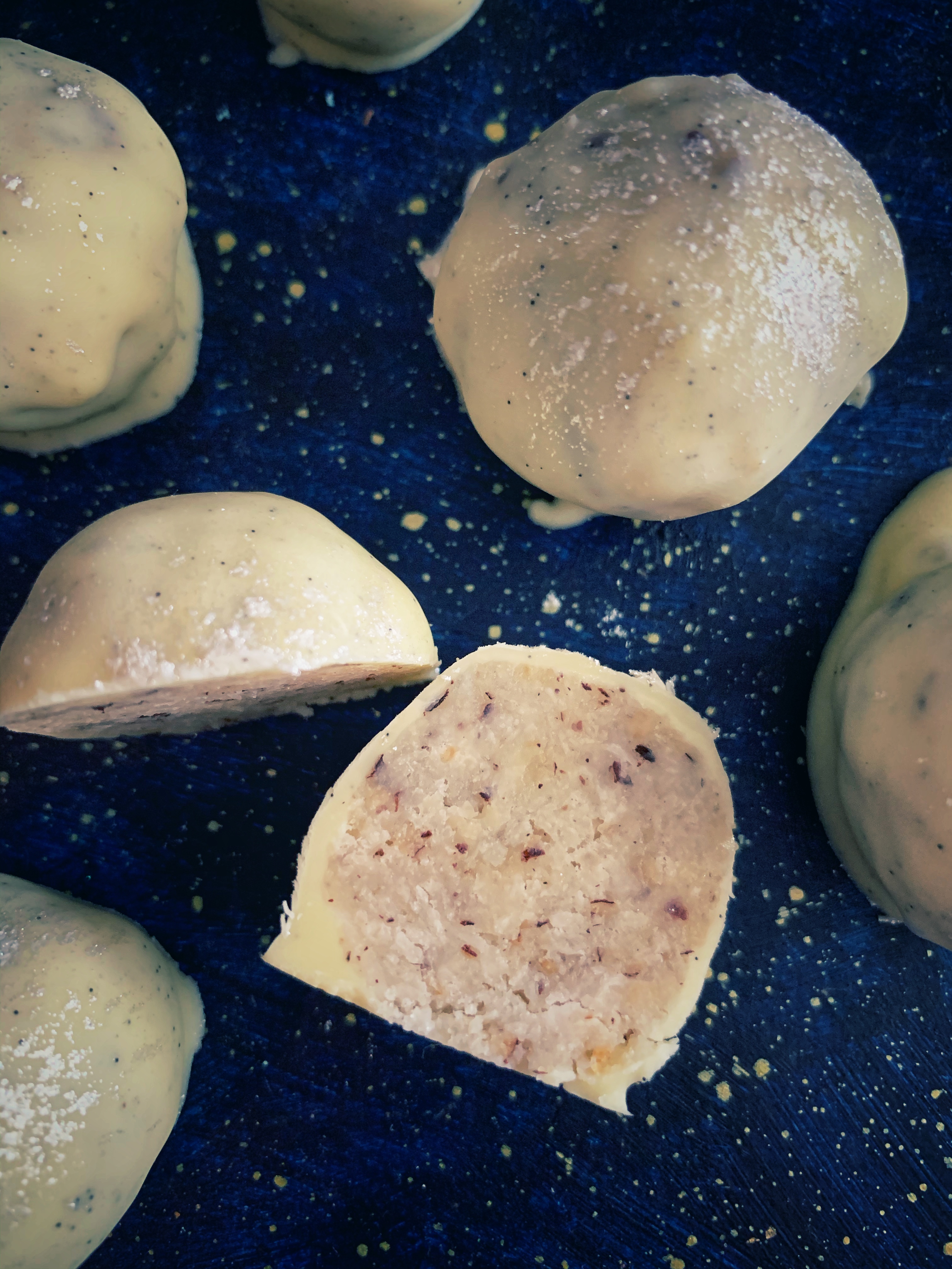 - One-by-one, drop the balls into the melted WHITE CHOCOLATE, turn to coat. Lift them out carefully with a fork, tapping off the excess on the side of the bowl. Then, put back on the lined baking tray. Sprinkle on some EDIBLE SILVER DUST, if using. Then place in the fridge to set.